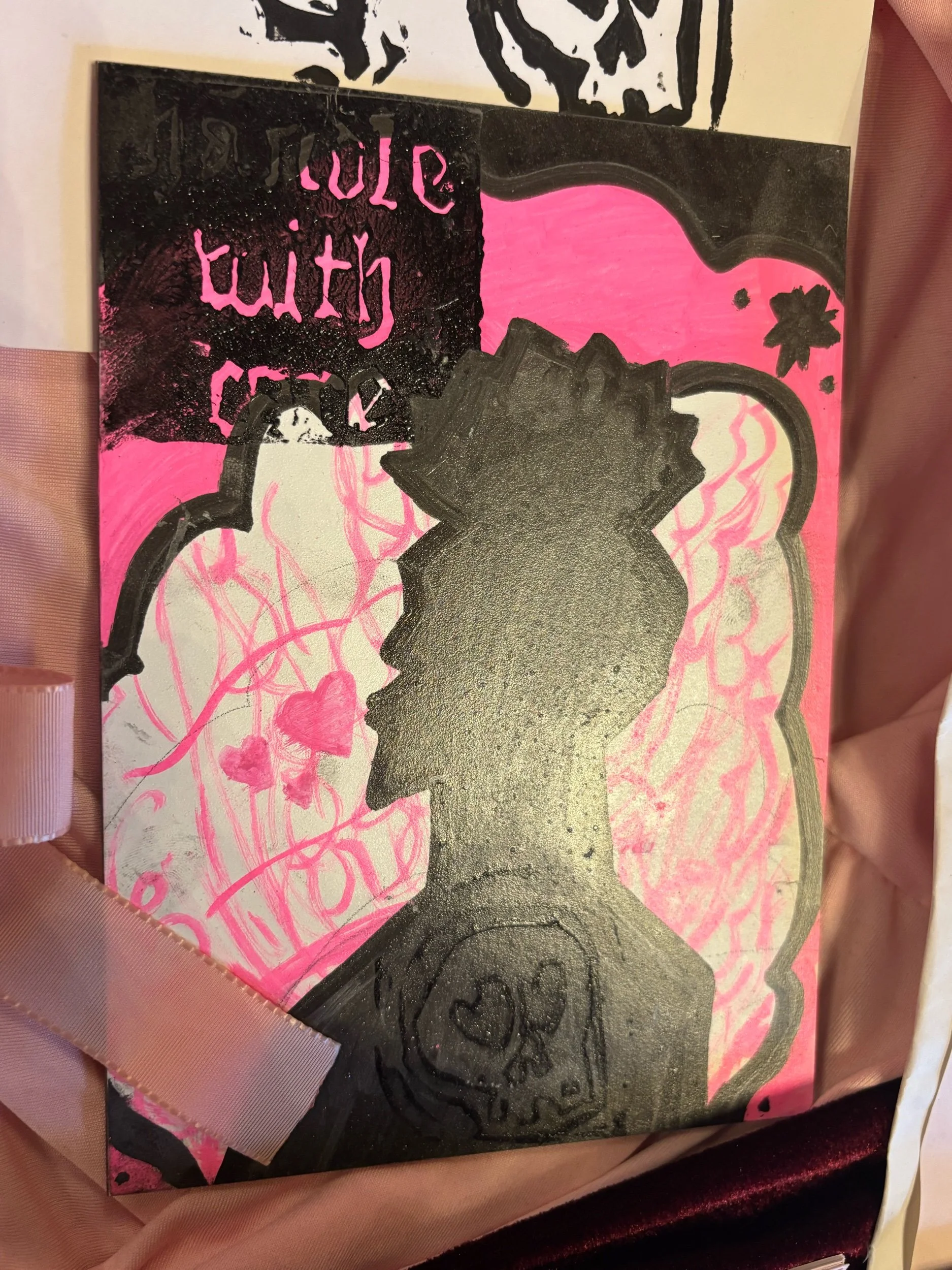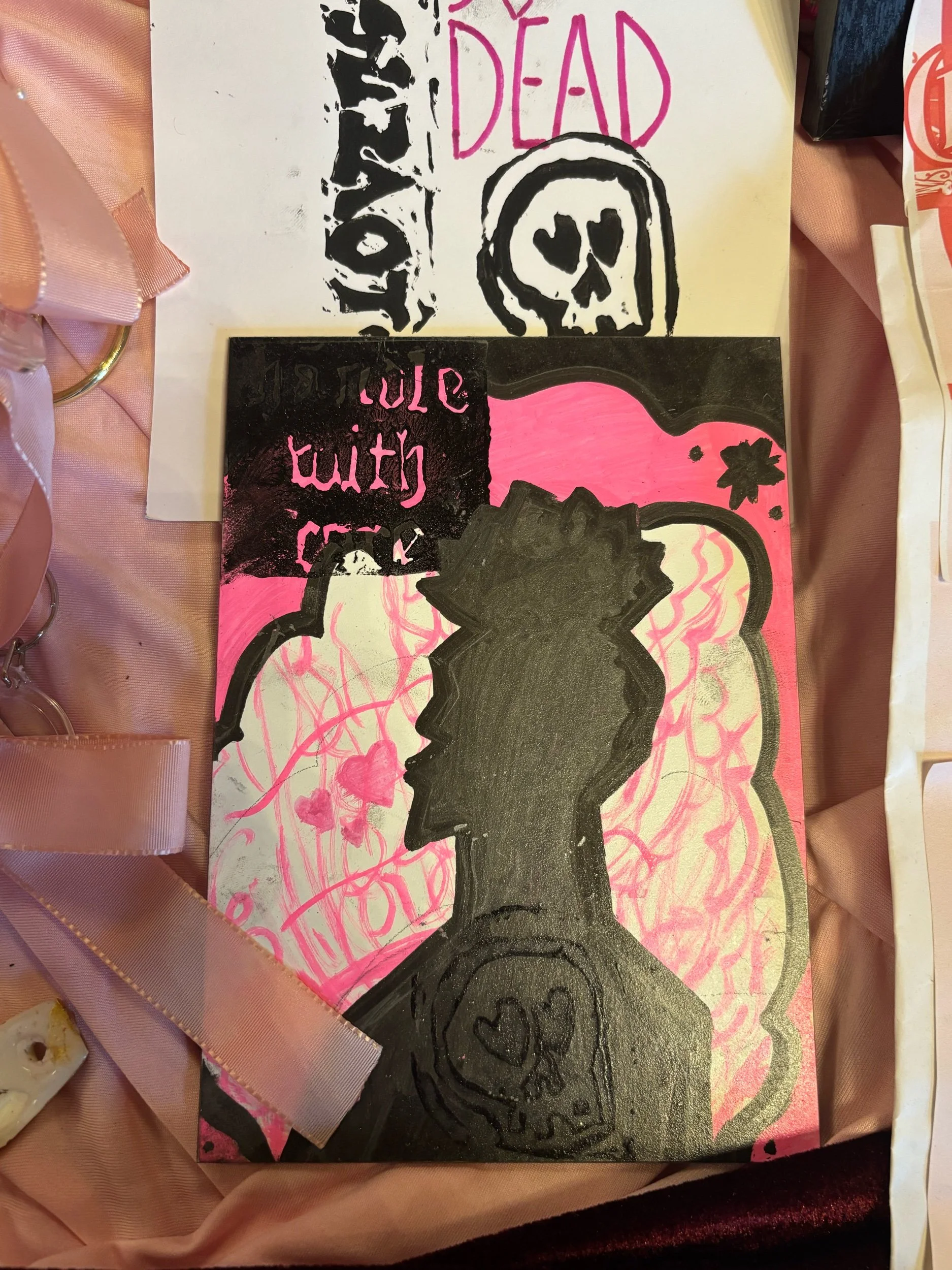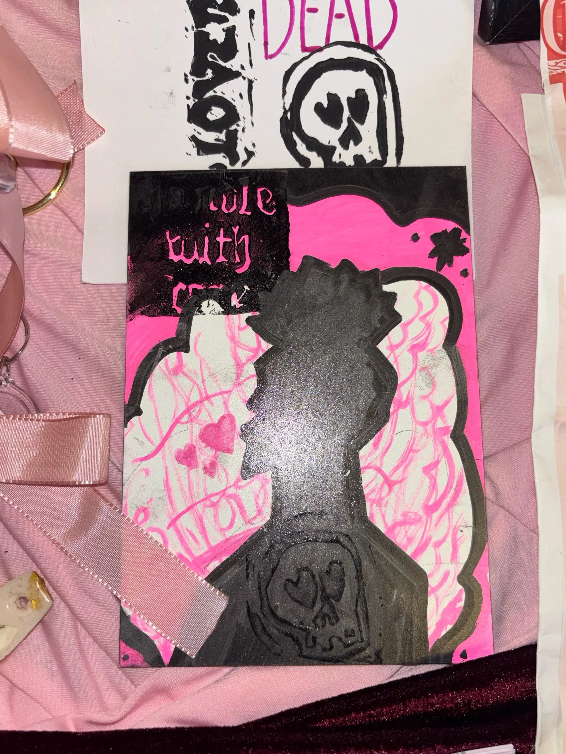 A5 painted piece with skull Lino print _ metallic black and neon pink