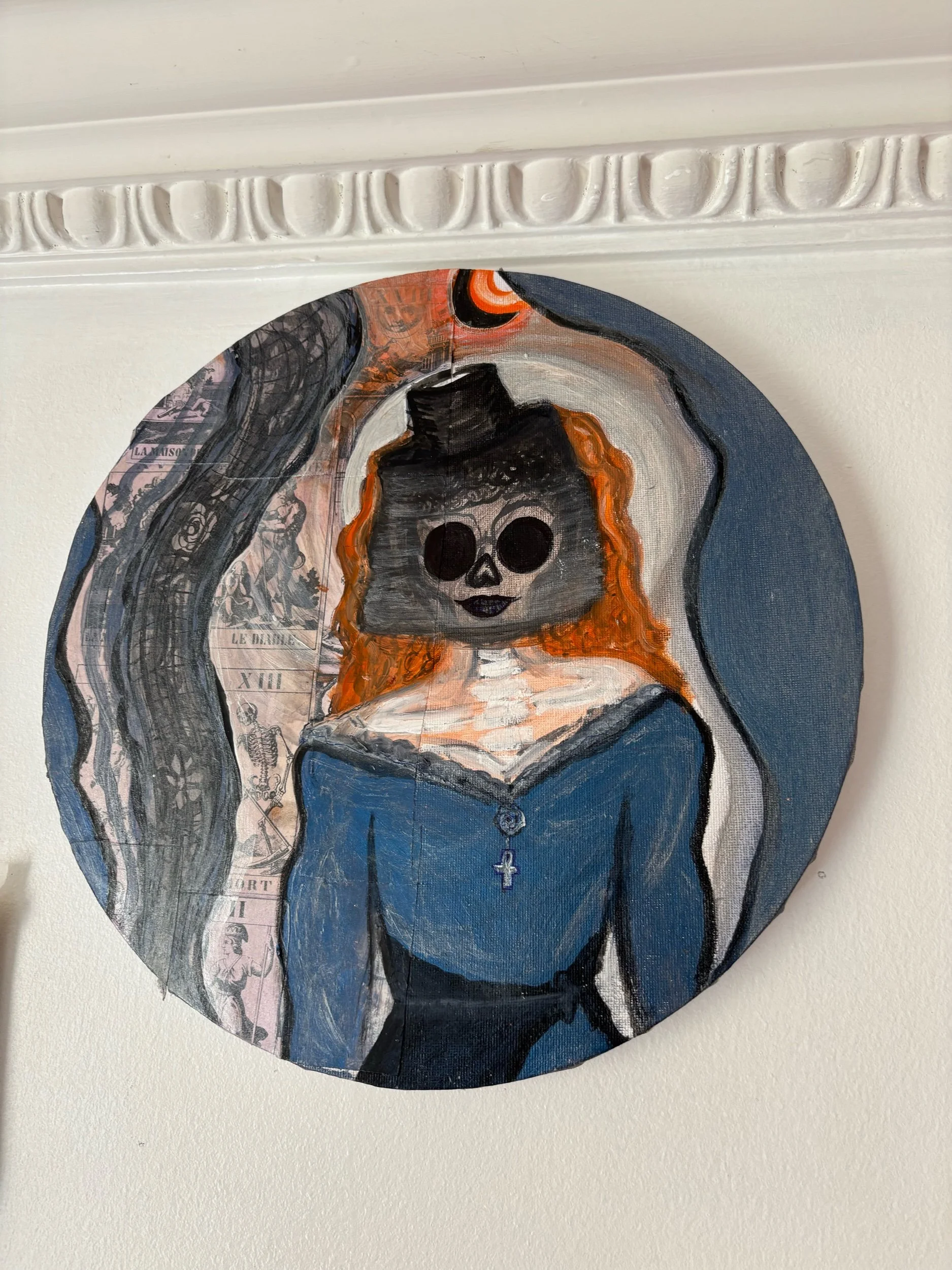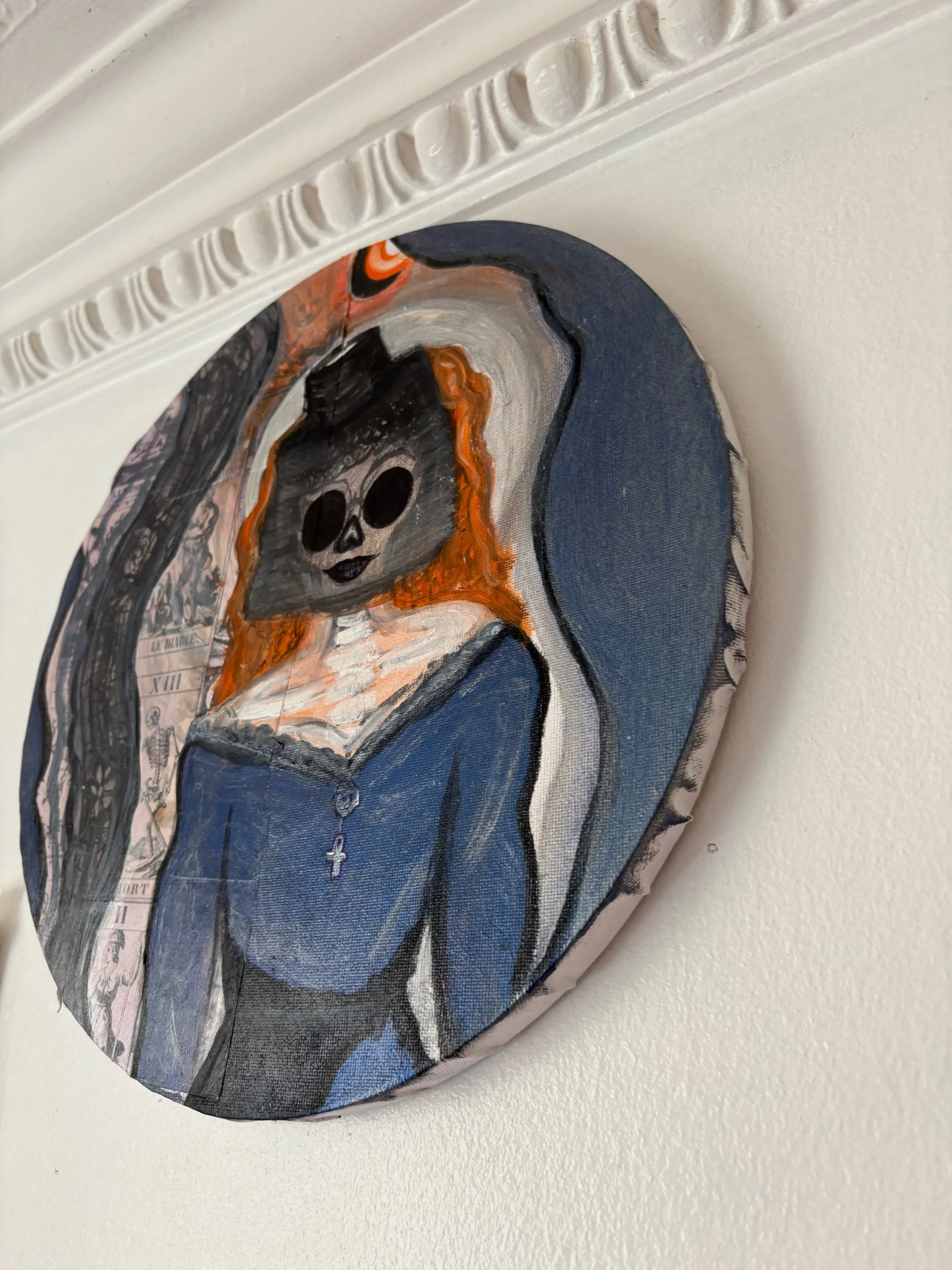 30cm diameter circular canvas, oil and acrylic on mixed media